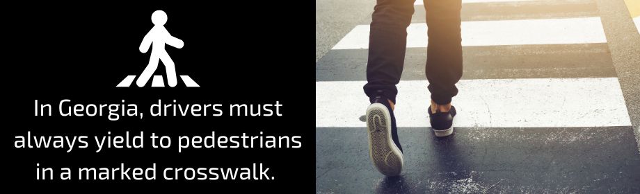 In Georgia, drivers must always yield to pedestrians in a marked crosswalk. In fact, the state asks that drivers do more than simply yield, but that they ‘stop and stay stopped’ for crossing pedestrians. And drivers must yield to any blind pedestrian (with or without a seeing-eye dog companion), regardless of whether the blind pedestrian is crossing at the marked crosswalk.